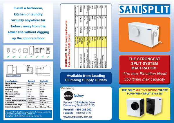 Profisplit macerates human feaces & toilet paper automatically pushing it up to 11m (max) vertically over 200m horizontally (depending on pipe size and friction loss). With an unbelievable 350 liters per minute (max) flow you can install a wet facility almost anywhere.
