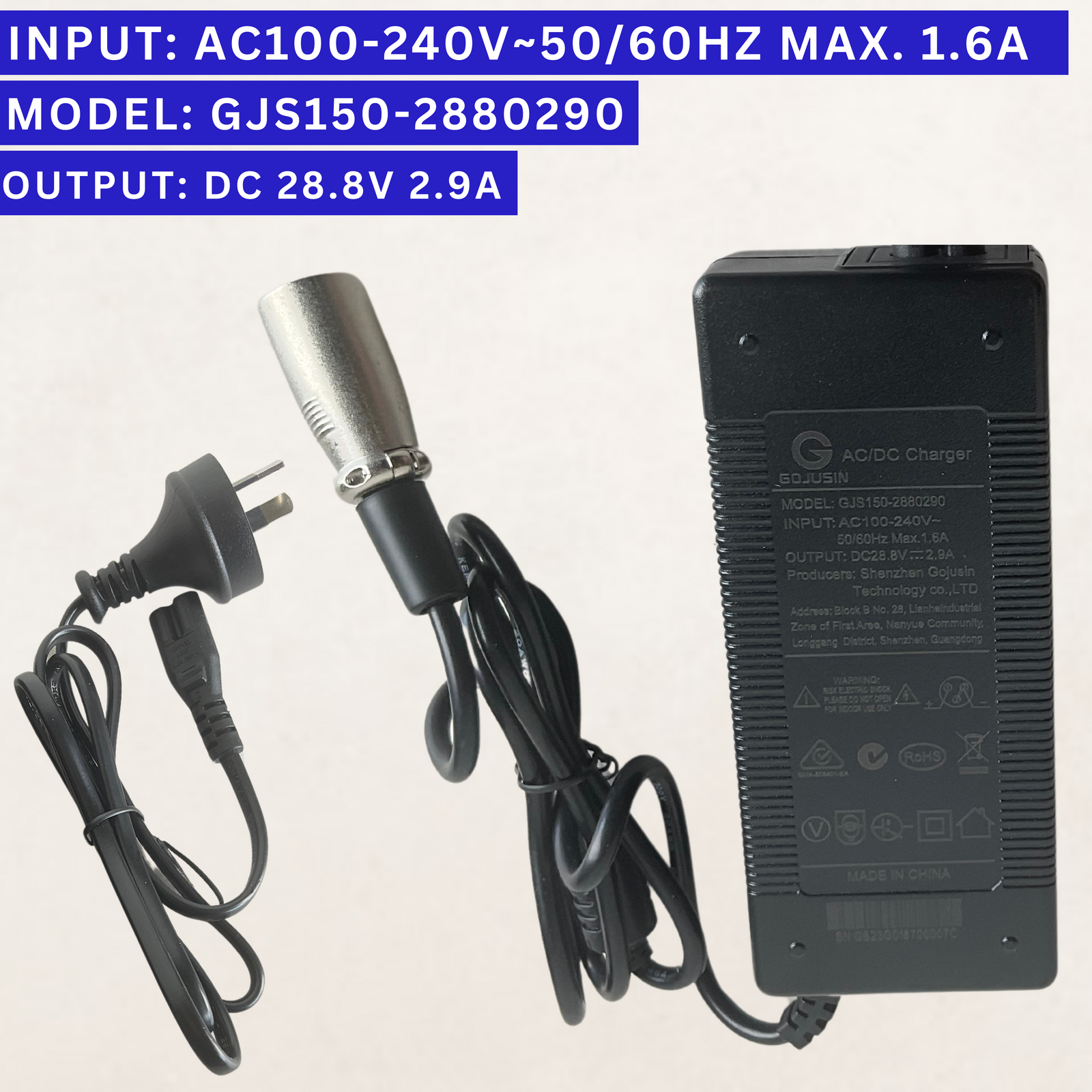 - Output: DC 28.8V 2.9A (Compatible with 24V 2A)
