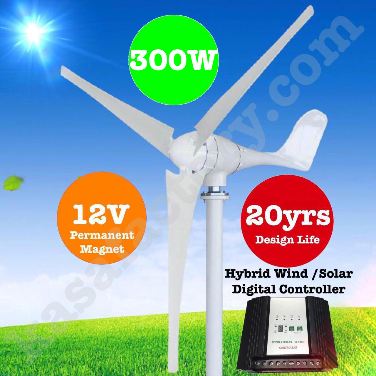 300W 12V Wind Turbine Generator 3 Blade - Digital Hybrid Wind/Solar Controller
