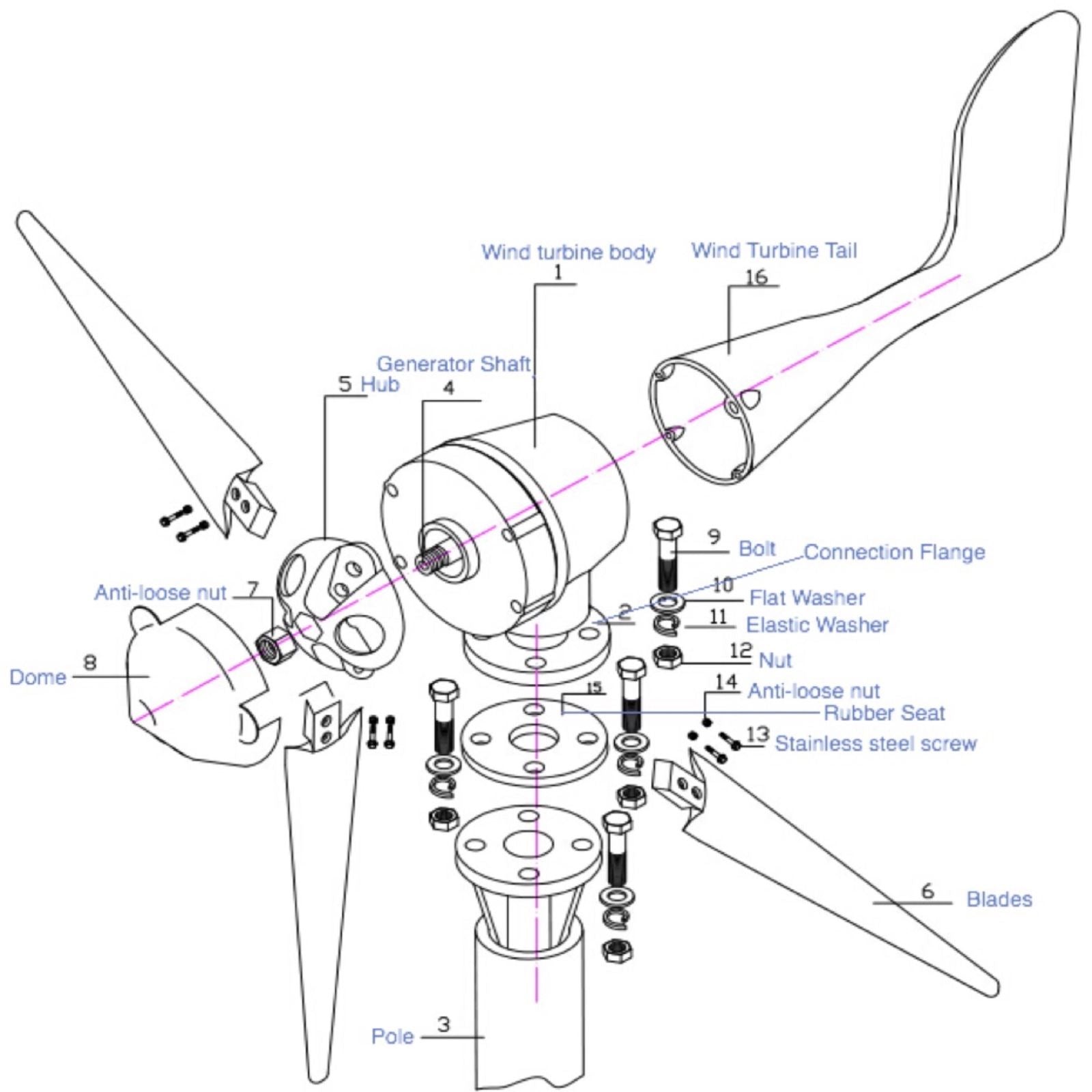 - Do not install blades upside down otherwise, bolts will not fit into the turbine hub (see install pictures)