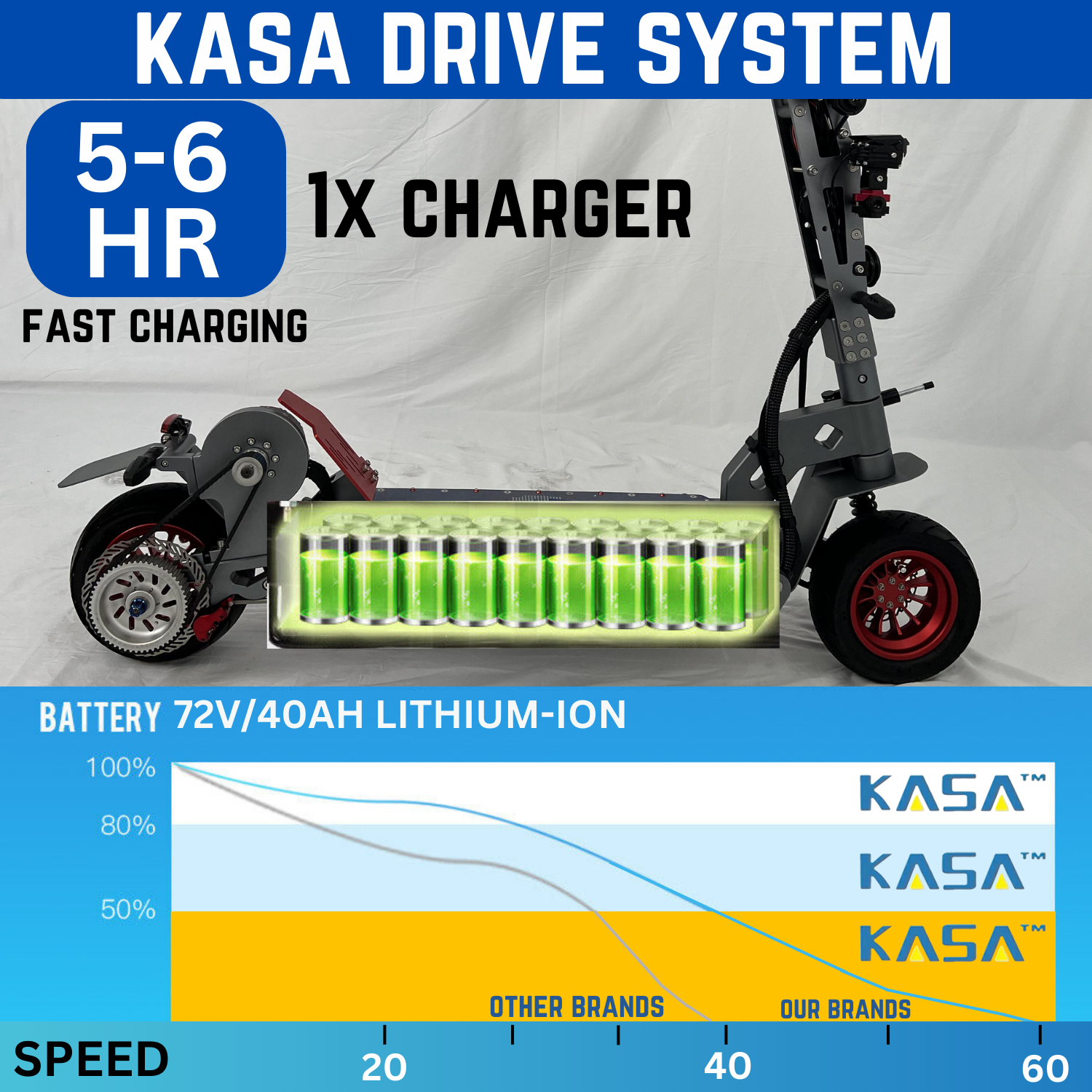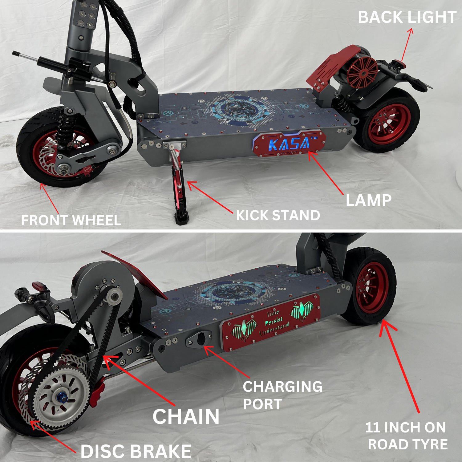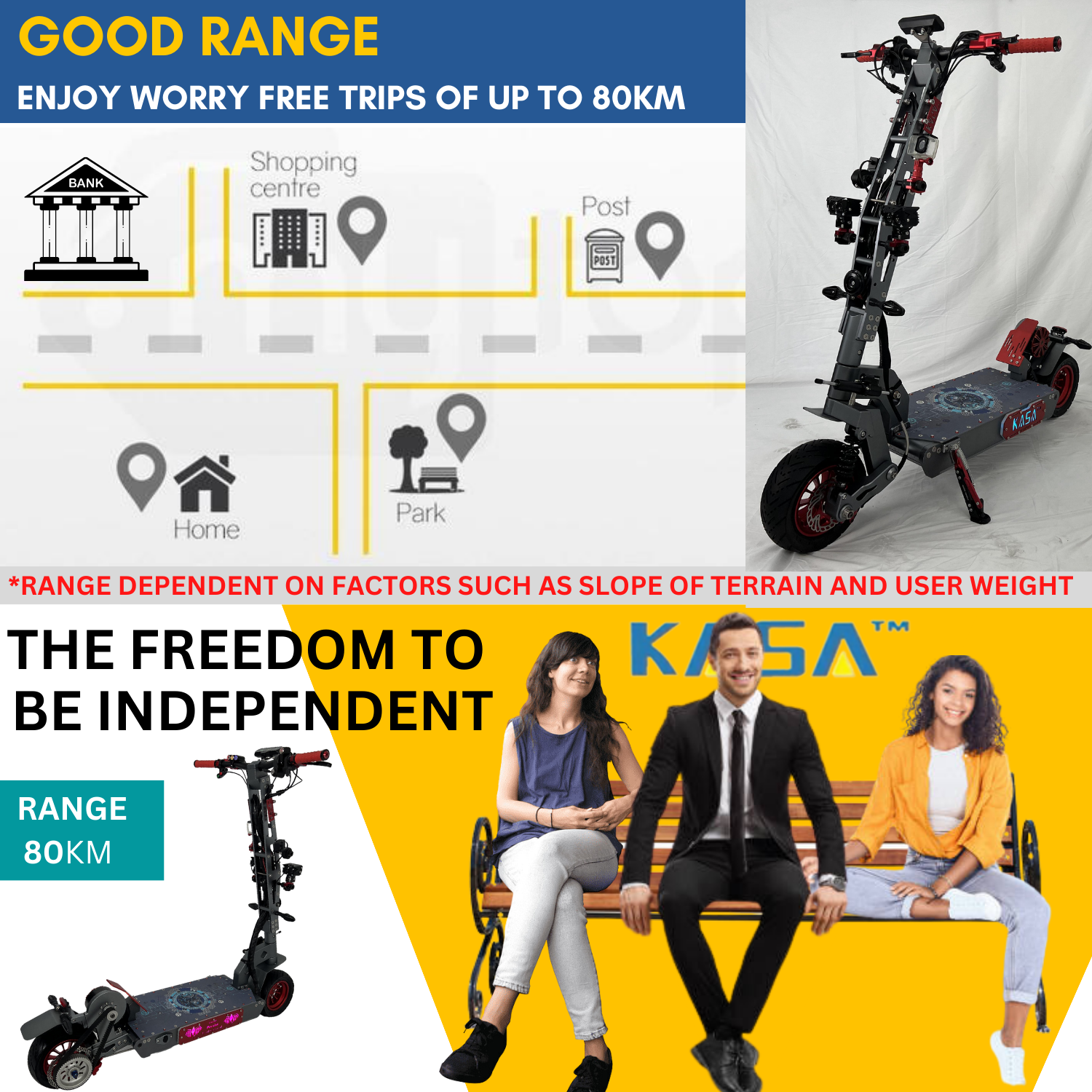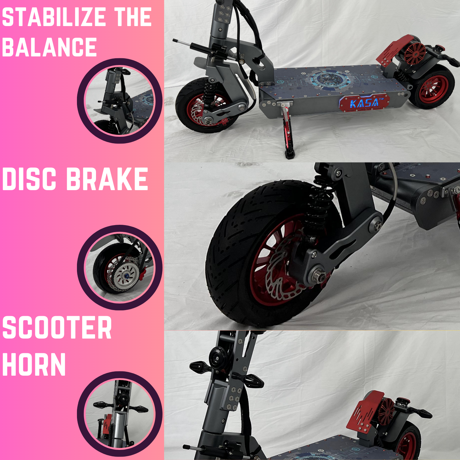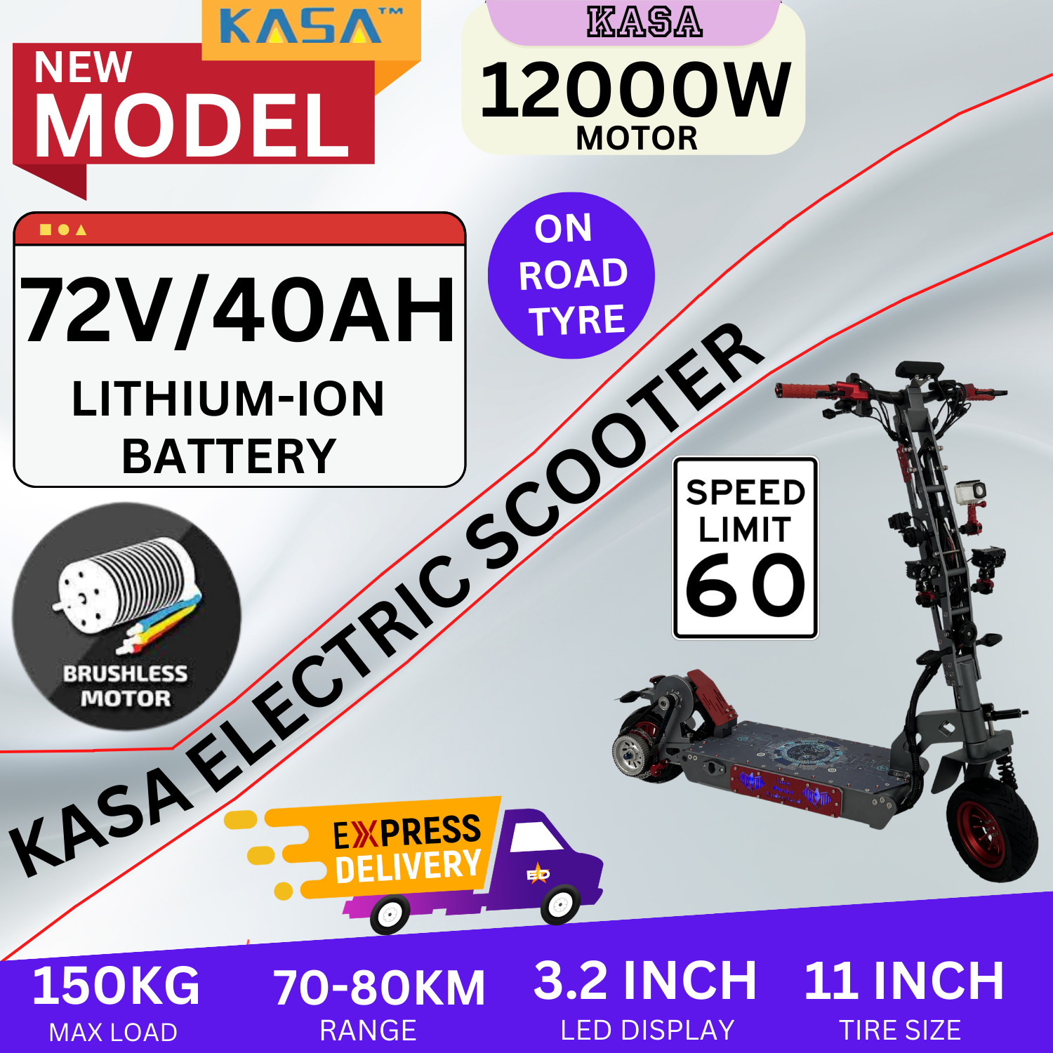 All the power is now in your hands with the KASA Electric Scooter. The 11" front and rear tire delivers a smoother ride on uneven terrain. The high-torque Power Core hub 12000W Motor delivers 60km/h top speeds up to 72V/40AH rechargeable battery provides up to 80kilometers of uninterrupted ride time on a single charge and up to 150kg max load weight the rear-wheel drive make the KASA electric scooter a safe, solid, and smooth ride to bring out your fun side.