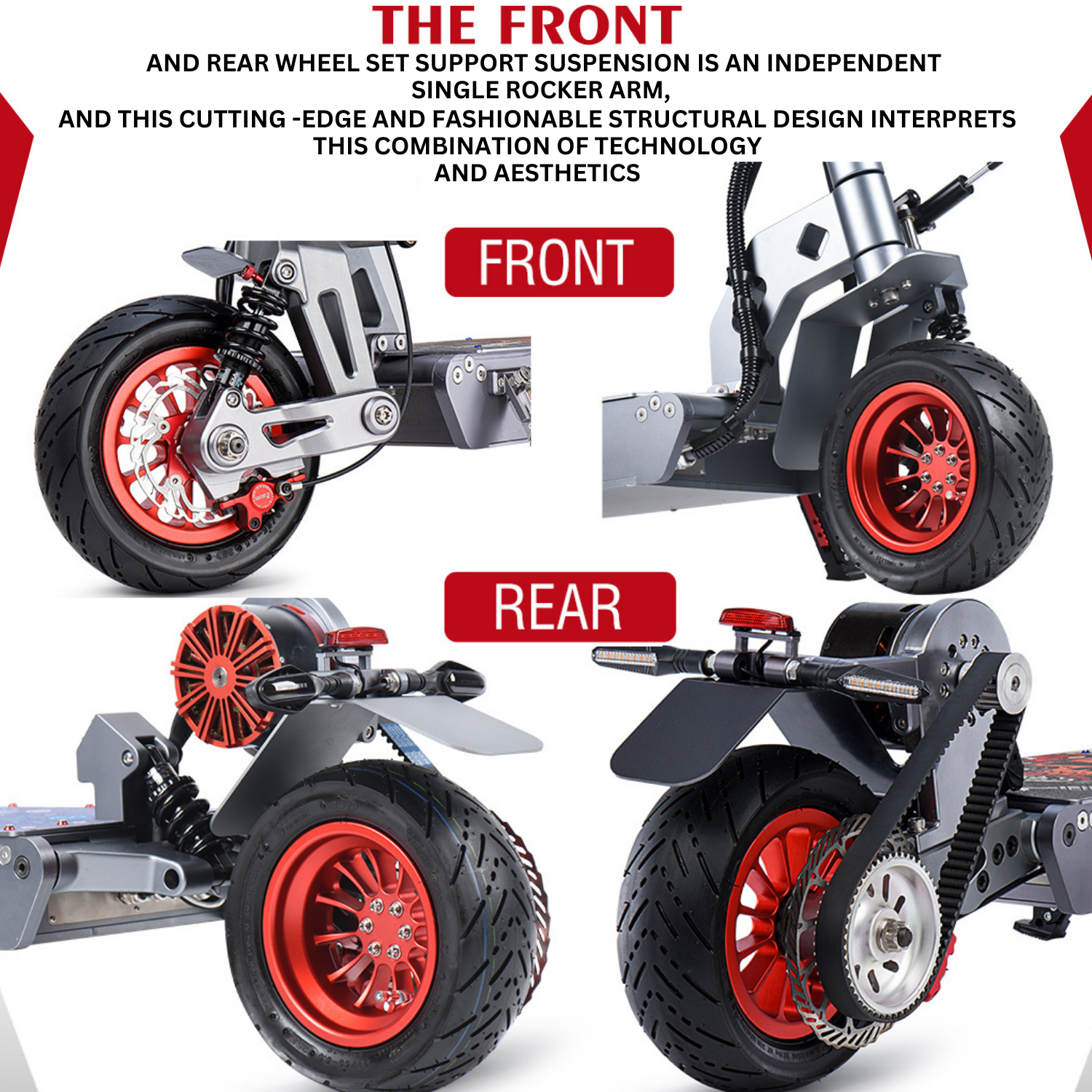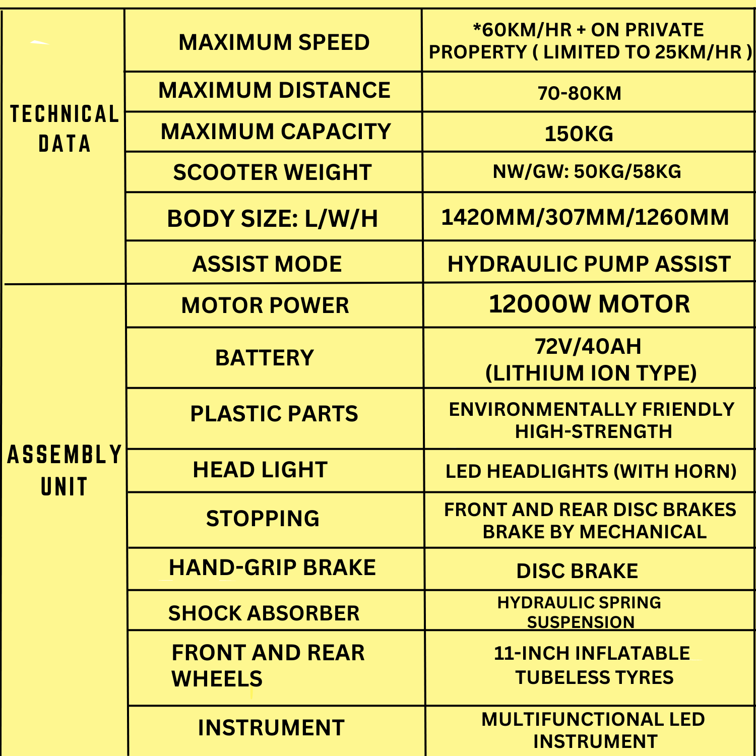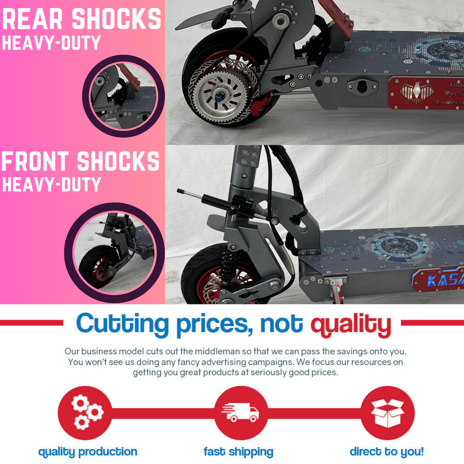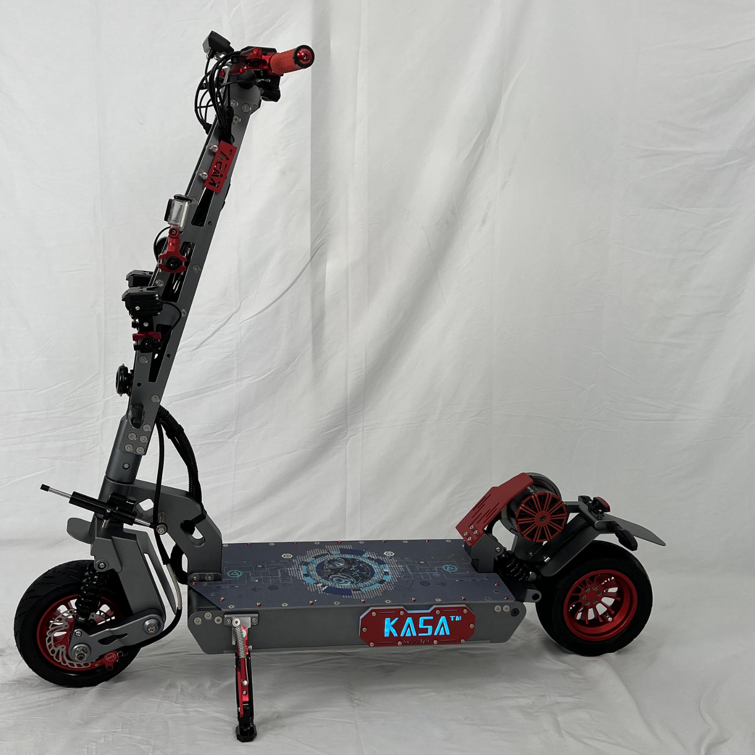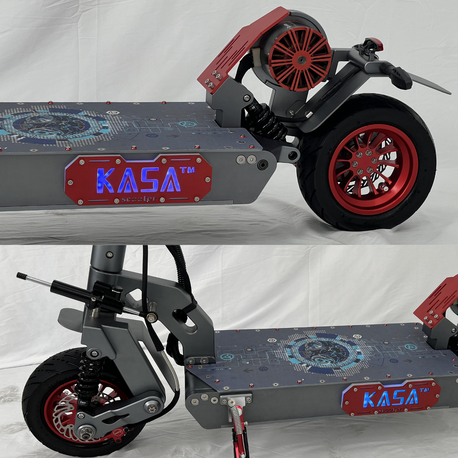 All the power is now in your hands with the KASA Electric Scooter. The 11" front and rear tire delivers a smoother ride on uneven terrain. The high-torque Power Core hub 12000W Motor delivers 60km/h top speeds up to 72V/40AH rechargeable battery provides up to 80kilometers of uninterrupted ride time on a single charge and up to 150kg max load weight the rear-wheel drive make the KASA electric scooter a safe, solid, and smooth ride to bring out your fun side.