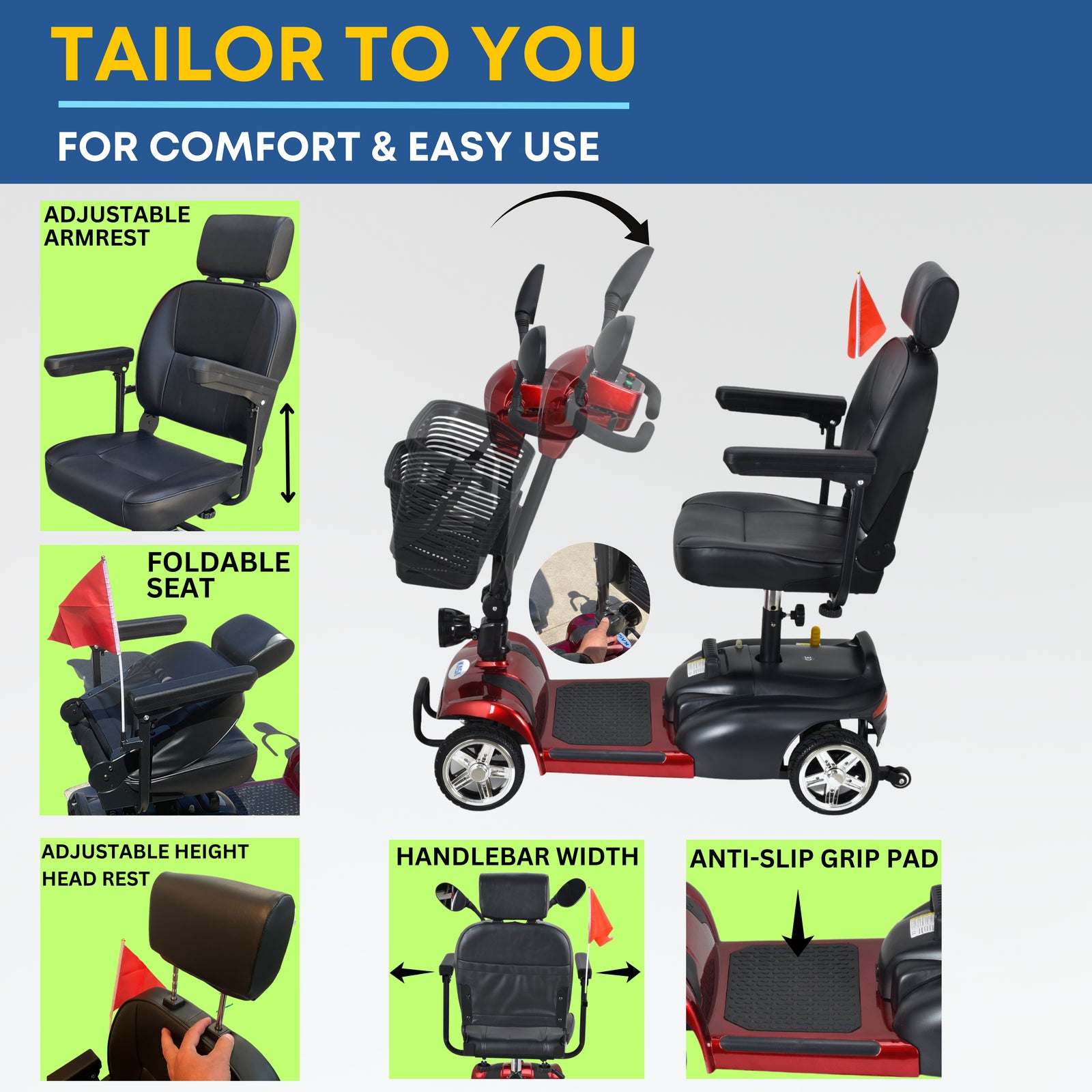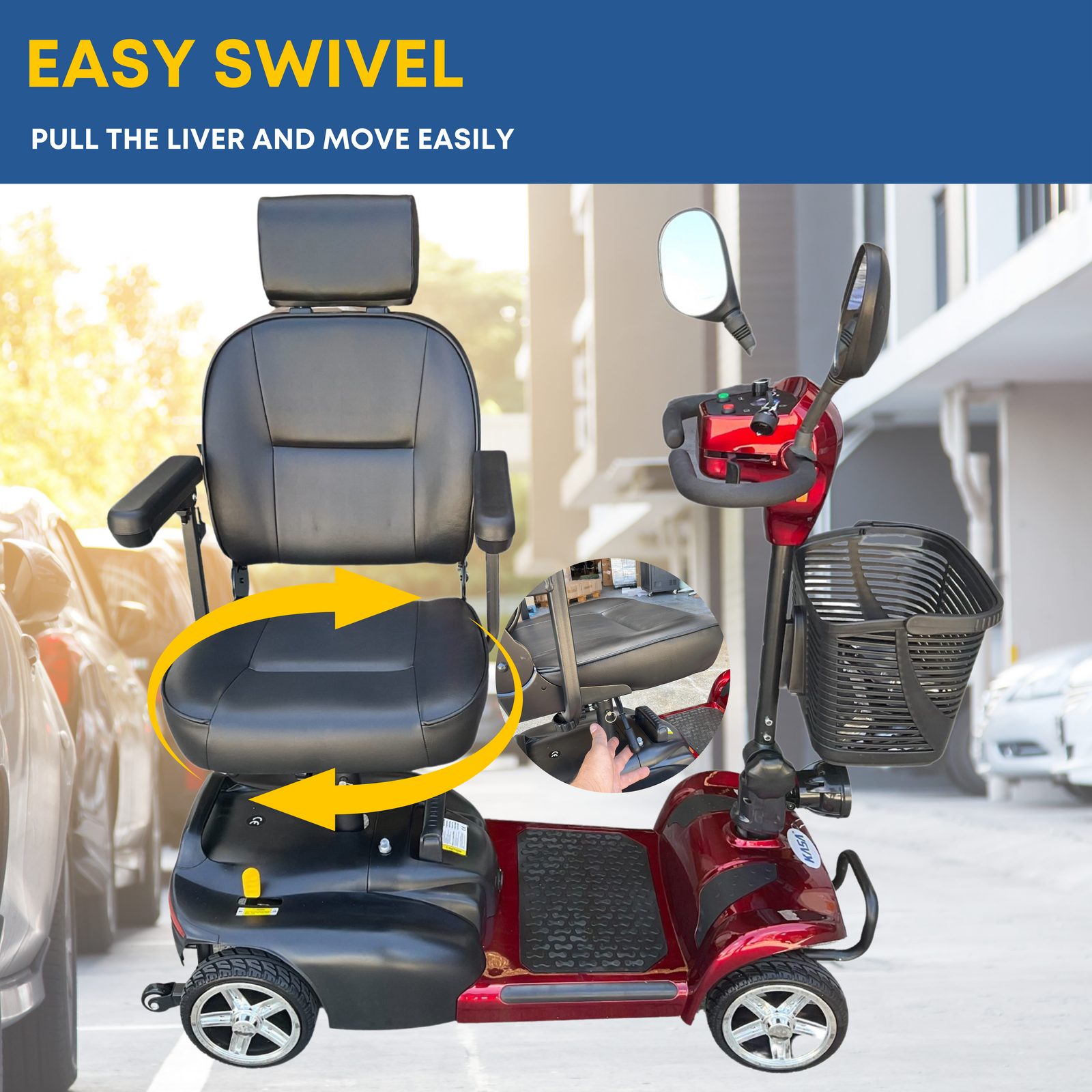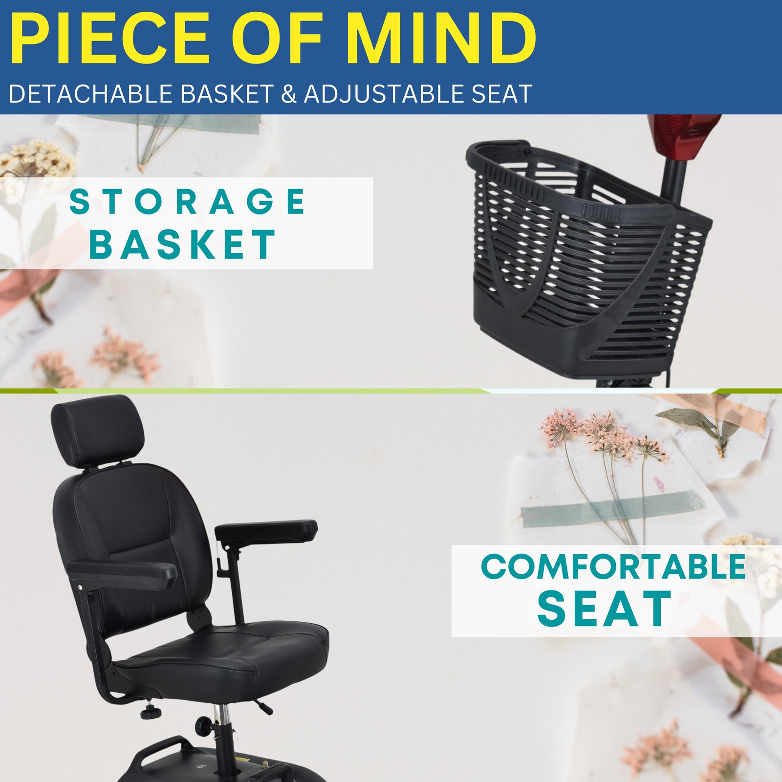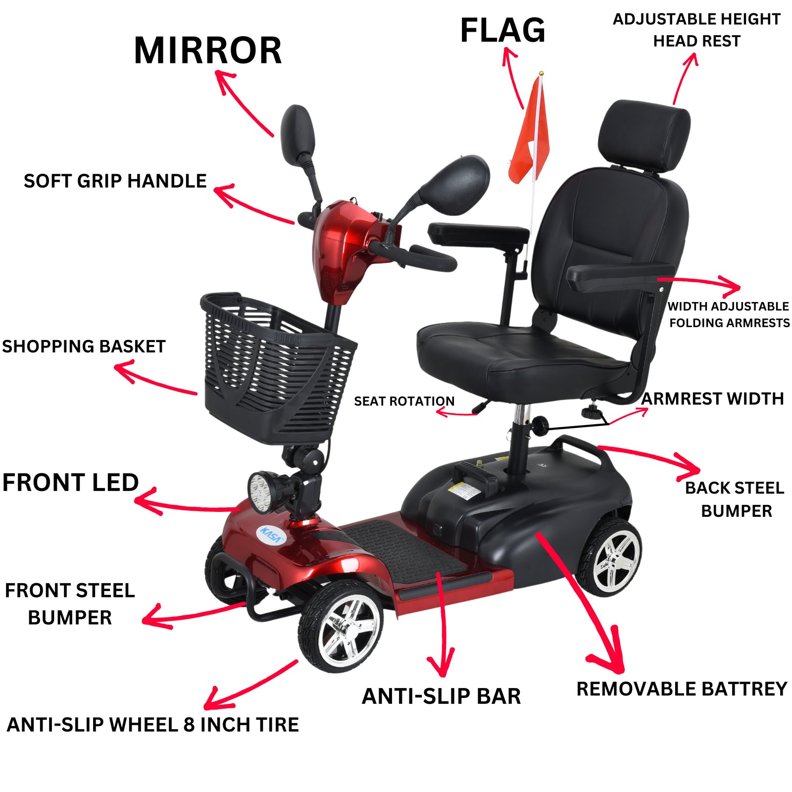 The KASA 4-wheel mobility scooter provides a convenient and comfortable mobility solution for users. With its compact size, it can easily maneuver over smooth indoor and outdoor surfaces, such as concrete, pavement, tile, and carpeting. The scooter is also equipped with a front-mounted storage basket for carrying daily essentials.