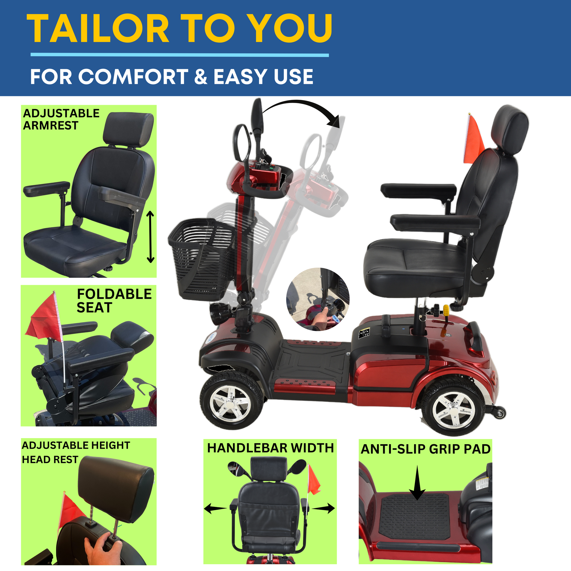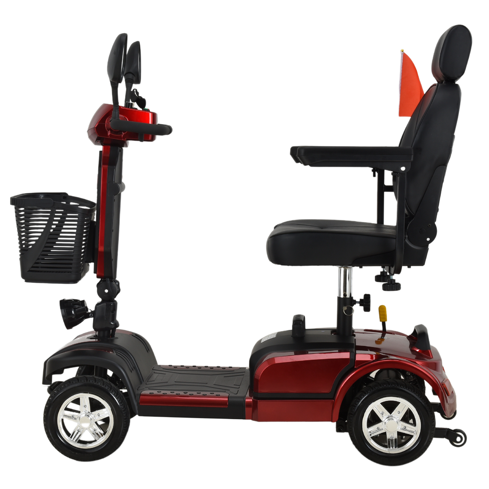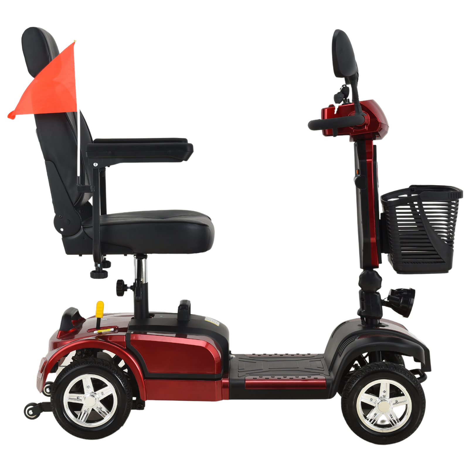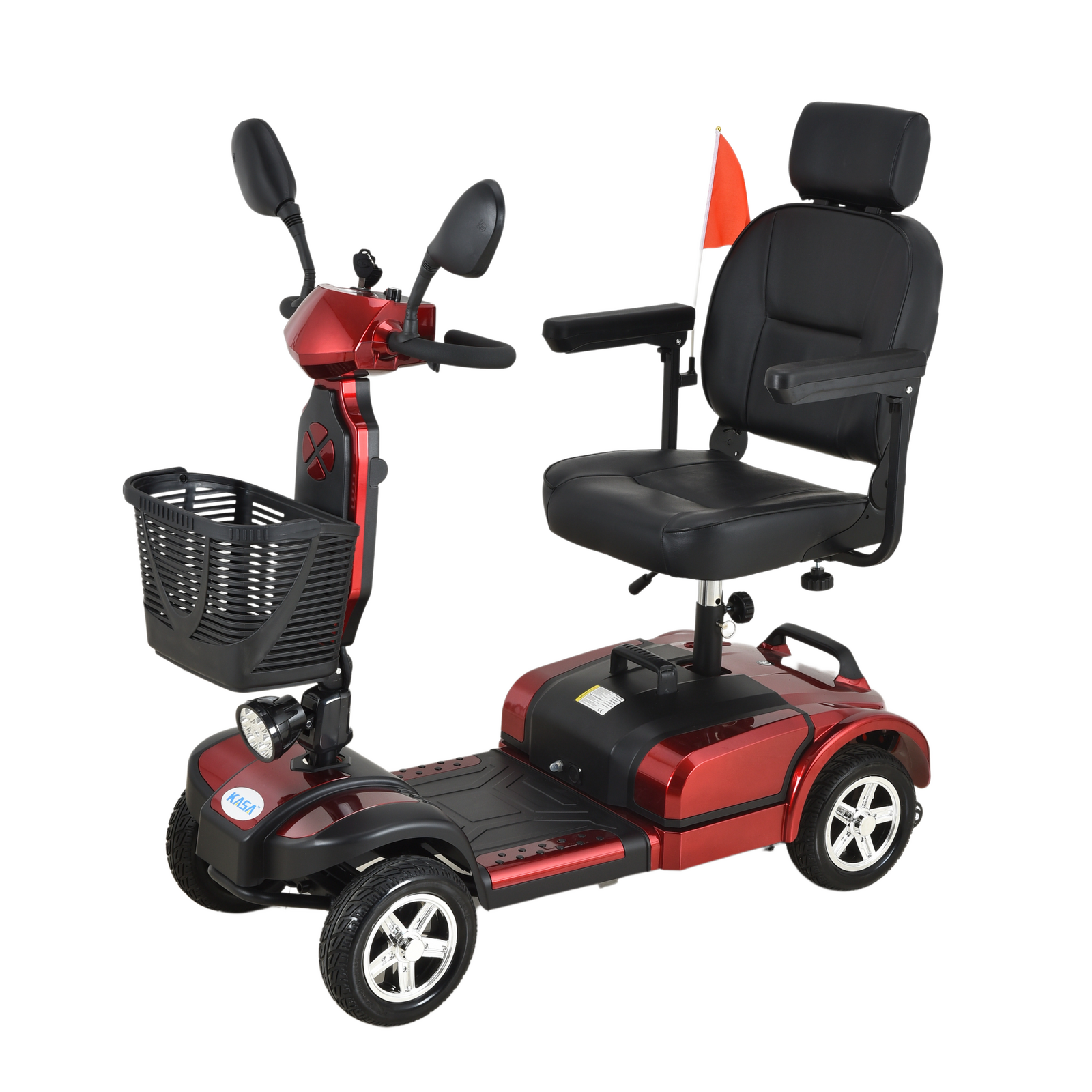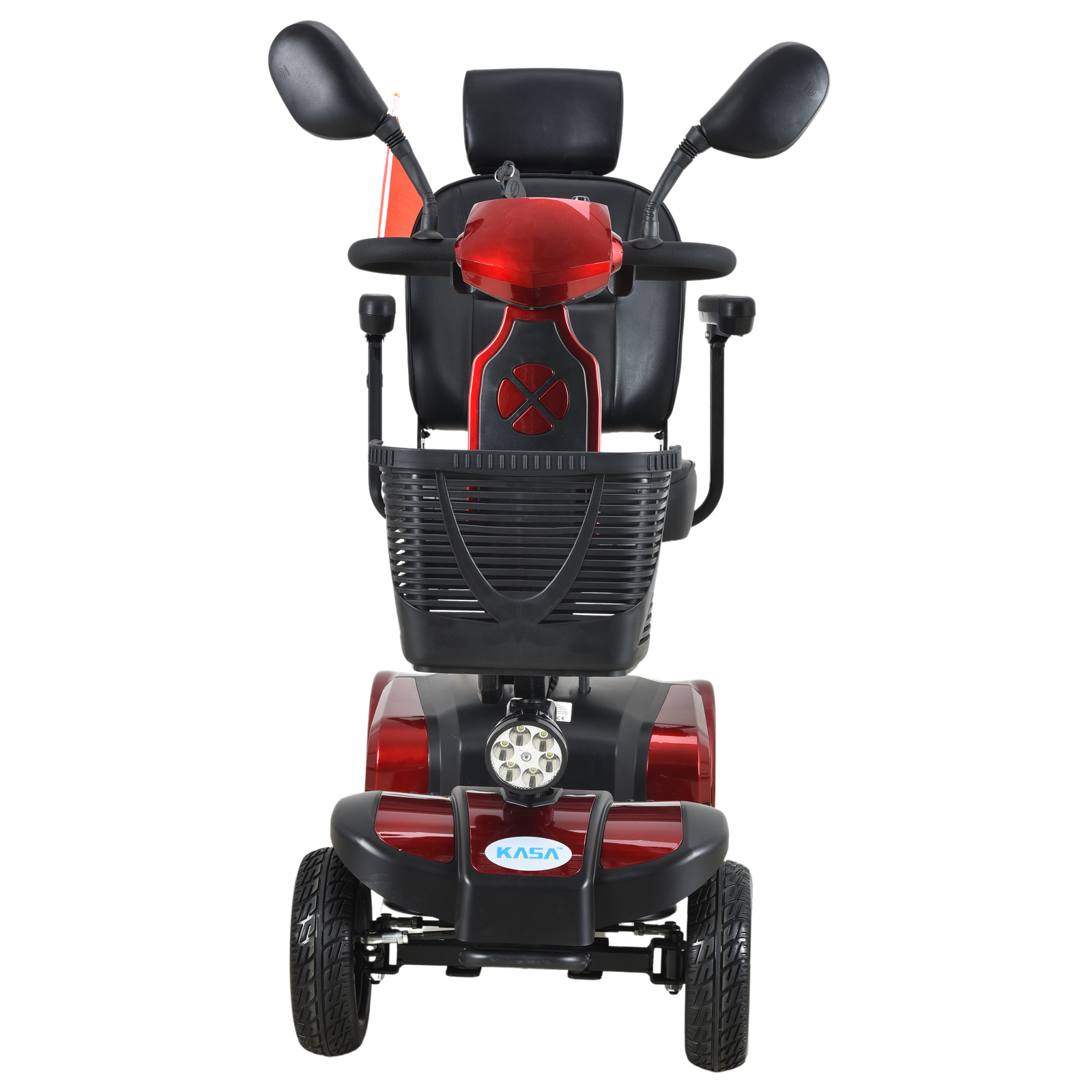 The KASA 4-wheel mobility scooter provides a convenient and comfortable mobility solution for users. With its compact size, it can easily maneuver over smooth indoor and outdoor surfaces, such as concrete, pavement, tile, and carpeting. The scooter is also equipped with a front-mounted storage basket for carrying daily essentials.