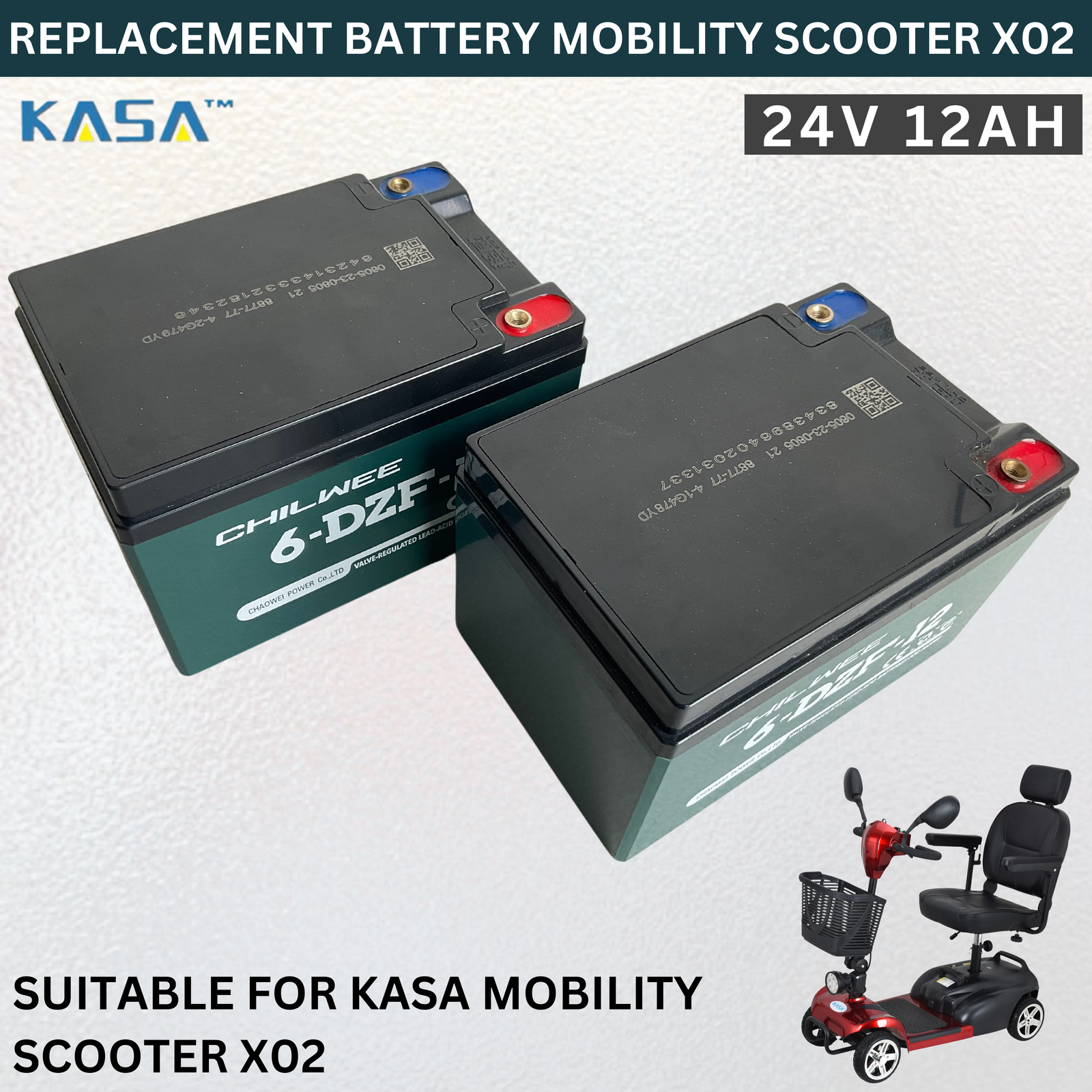 The KASA Electric Mobility Scooter Replacement Battery is designed specifically for the KASA X02 mobility scooter, ensuring a perfect fit and reliable performance. This ( 12 X 2 ) 24V 12Ah battery offers robust power and durability, providing an extended range to enhance your mobility experience.