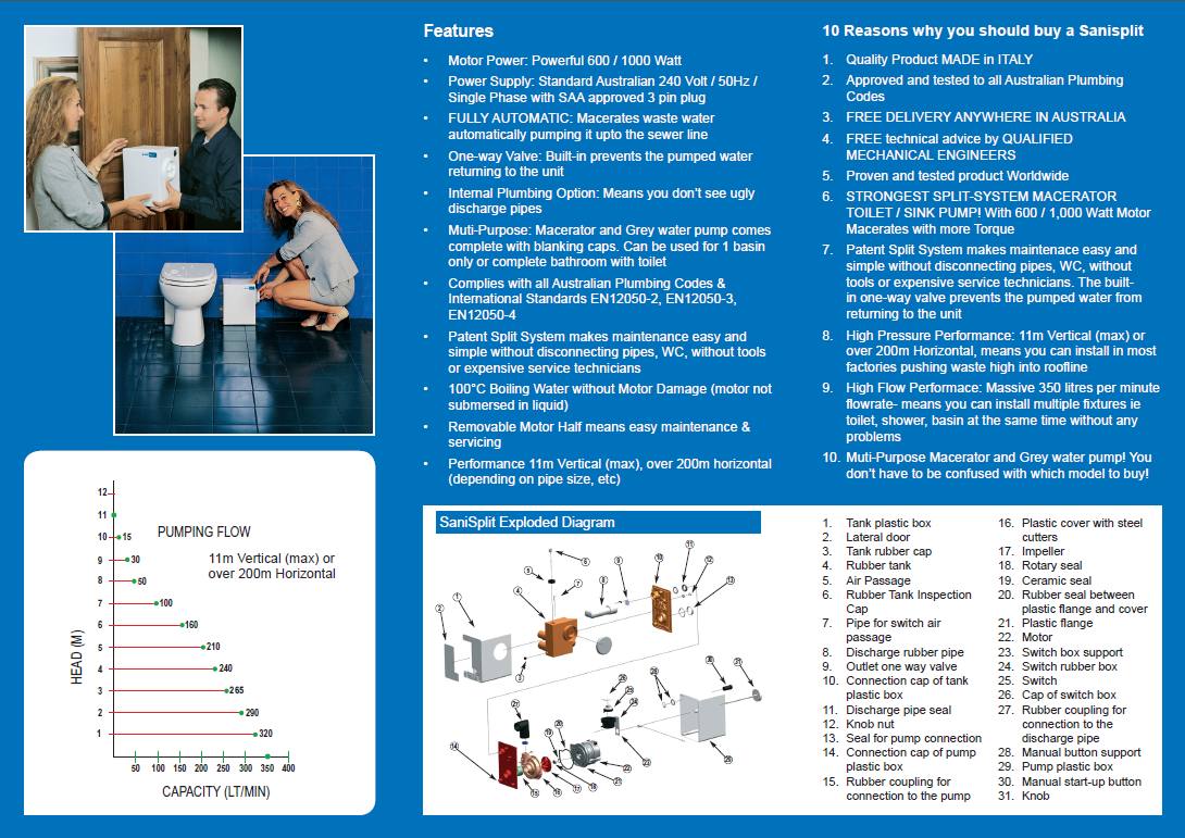 Sanisplits functionality is simple and straightforward: a sensitive pressure switch and a sophisticated electrical circuit inside the Sanisplit sense the flush and start a very powerful macerating pump. The macerating pump then liquifies the waste and pumps it up and away to existing plumbing.